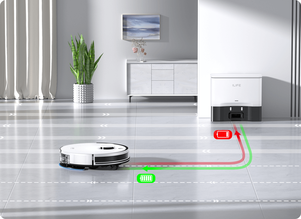 バッテリー残量が少なくなると、ロボットは自動的に充電ステーション(自動ゴミ収集)に戻り、終了した場所から清掃を再開します。
